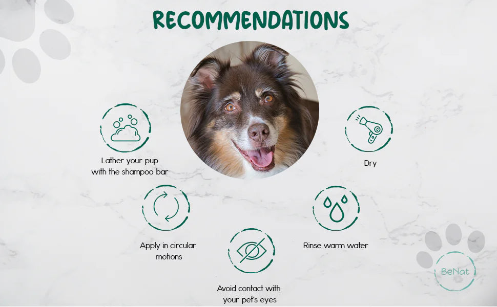 Directions: Underwater, work the soap bar into a lather and apply it. Gently massage it into your pet's fur with a circular motion. Avoid getting the soap in your pet's eyes. Rinse with cool or warm water and pat dry.